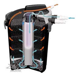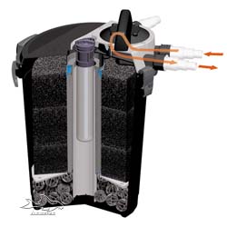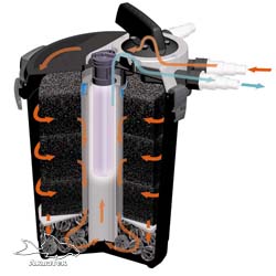 Устройство фильтра Aquael KlarPressure UV 8000 отвечает самым современным технологиям фильтрации в декоративных прудах. Как и все совеменные фильтры, он обеспечивает многоступенчатую фильтрацию прудовой воды, обеспечивая ее механическую, биологическую и химическую очистку. Для этого фильтр полностью укомплектован необходимыми фильтрующими материалами - биошарами, крупнопористыми губками, а также ультрафиолетовым стерилизатором мощностью 11 Вт для эффективной борьбы с водорослями и патогенными микроорганизмами в пруду.