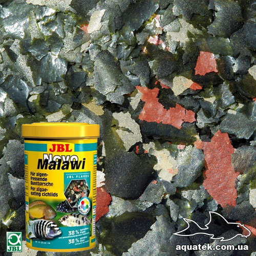 JBL NovoMalawi состоит в основном из водорослей Spirulina platensis, так же как и растительного сырья, также в состав этого корма включена небольшая часть животного белка, специально сбалансированного для цихлид озер Малави и Танганьика, основной рацион питания которых составляют водоросли.