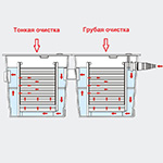 Грязь и взвесь задерживаются на фильтрующих элементах при прохождении воды через фильтр. Кроме того, в порах фильтрующих элементов живут полезные микроорганизмы, осуществляющие биофильтрацию, их заселение лучше предусмотреть перед запуском рыбы или посадкой основных водных растений, так как микрофлора пруда особенная.