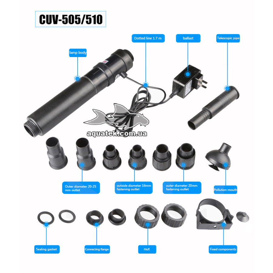 Sunsun CUV 510 - ультрафиолетовый стерилизатор, предназначенный для использования в морских и пресноводных аквариумах объёмом до 500 литров. Конструкция стерилизатора позволяет использовать его как внутри, так и снаружи аквариума.