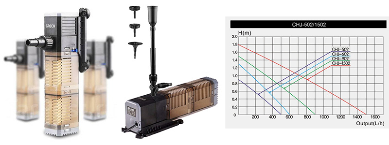 GRECH CHJ-1502 - это погружной фильтр для аквариумов объемом до 350 литров. Производительность фильтра составляет 1500 литров в час. В фильтре GRECH CHJ-1502 есть плавная регулировка мощности. Фильтр легко крепится к боковым стенкам аквариума при помощи надежных присосок.