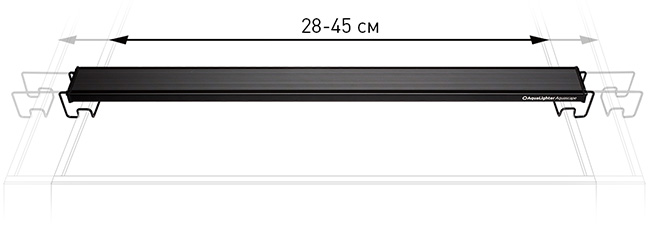 Регулируемые крепления AquaLighter Aquascape (30 см) позволяют установить его на аквариумы длиной от 28 до 45 см и толщиной стенок до 12 мм.
