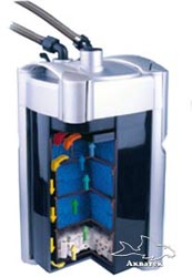 | Отсюда можно сделать один соответствующий вывод – внешний фильтр удобен для любого аквариума. В первую очередь по причине больших временных промежутков между его обслуживанием (или иными словами очисткой и промывкой). Еще один большой плюс внешнего фильтра это то, что фильтрующие материалы могут быть разными, отделяемые друг от друга при помощи специальных контейнеров для этих наполнителей (или как говорят - корзин). Как пример можно привести следующее: в один из таких контейнеров можно поместить довольно крупнопористый материал, например крупнопористую губку или керамические кольца, которые будут служить для удержания из протекающей воды крупных взвесей и для распределения потоков воды в самом фильтре. Стоит упомянуть здесь следующее: чем медленнее протекает вода через фильтрующий материал, тем эффективней происходит фильтрация. При использовании внешнего фильтра, за счет большой площади фильтрующих материалов и равномерного распределения воды по фильтрующему материалу, фильтрация в аквариуме происходит гораздо эффективней, чем в любом внутреннем фильтре. И конечно же эффективность фильтрации в геометрической прогрессиивозрастает за счет количества фильтрующих материалов. Далее для примера мы можем привести активированный уголь, который также можно поместить в один из контейнеров внешнего фильтра в достаточно большом количестве,